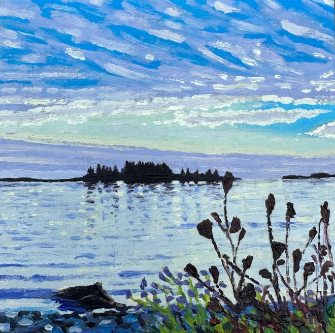 I am back on Vinalhaven for some painting and inspiration! We pulled in late yesterday afternoon and it feels so good to be back in my happy place. I am so looking forward to trail walks, rock hopping, sunrises and sunsets and of course painting, napping and reading books! Here’s a little dusk painting which was a fun one to paint … all of island brush and little islands getting tucked in for a night under the stars.